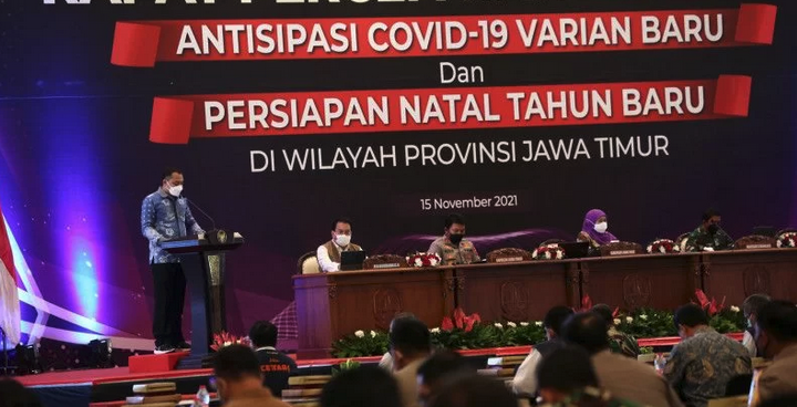 Wali Kota Surabaya Eri Cahyadi saat memaparkan sejumlah langkah antisipasi gelombang tiga COVID-19 dalam rapat Percepatan Vaksinasi Antisipasi COVID-19 Varian Baru dan Persiapan Natal Tahun Baru 2022 dengan Forkopimda Jatim di Grand City, Kota Surabaya, Senin (15/11/2021) malam